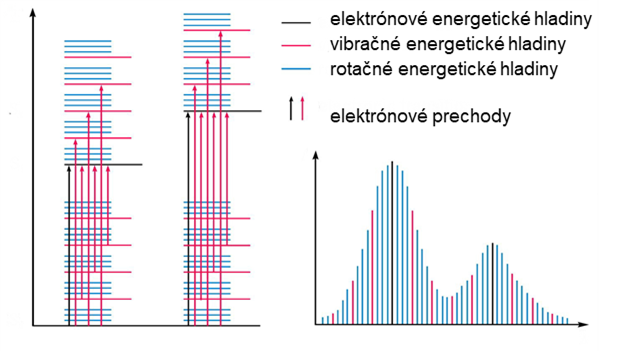 Ako vidieť na obrázku 3, absorpčné prechody látky môžu prebiehať z rôznych vibračných a rotačných stavov základného elektrónového stavu molekuly do rôznych vibračných a rotačných stavov jej excitovaného elektrónového stavu. Všetky zmeny vibračnej a rotačnej energie sa pripočítajú k energii preskoku elektrónov a vzniká celá sústava spektrálnych čiar, ktorých vlnová dĺžka sa líši len v malej miere. Čiarové spektrá (kvantový charakter absorpcie žiarenia) sa prekrývajú a v spektre sa to prejavuje ako molekulový absorpčný pás.