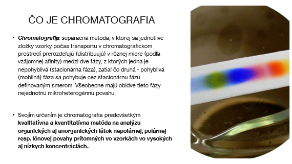 Chromatografia je separačná metóda, v ktorej sa jednotlivé zložky vzorky počas transportu v chromatografickom prostredí prerozdeľujú (distribuujú) v rôznej miere (podľa vzájomnej afinity) medzi dve fázy, z ktorých jedna je nepohyblivá (stacionárna fáza), zatiaľ čo druhá - pohyblivá (mobilná) fáza sa pohybuje cez stacionárnu fázu definovaným smerom. Všeobecne majú obidve tieto fázy nejednotnú mikroheterogénnu povahu. Svojím určením je chromatografia predovšetkým kvalitatívna a kvantitatívna metóda na analýzu organických aj anorganických látok nepolárnej, polárnej resp. iónovej povahy prítomných vo vzorkách vo vysokých aj nízkych koncentráciách.
